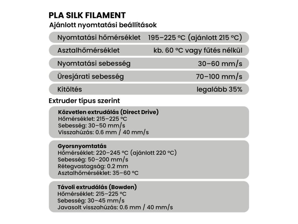 | Megjegyzés | A selyem PLA nagyobb hőtágulású; nem ajánlott hosszú Bowden rendszerekhez. |
