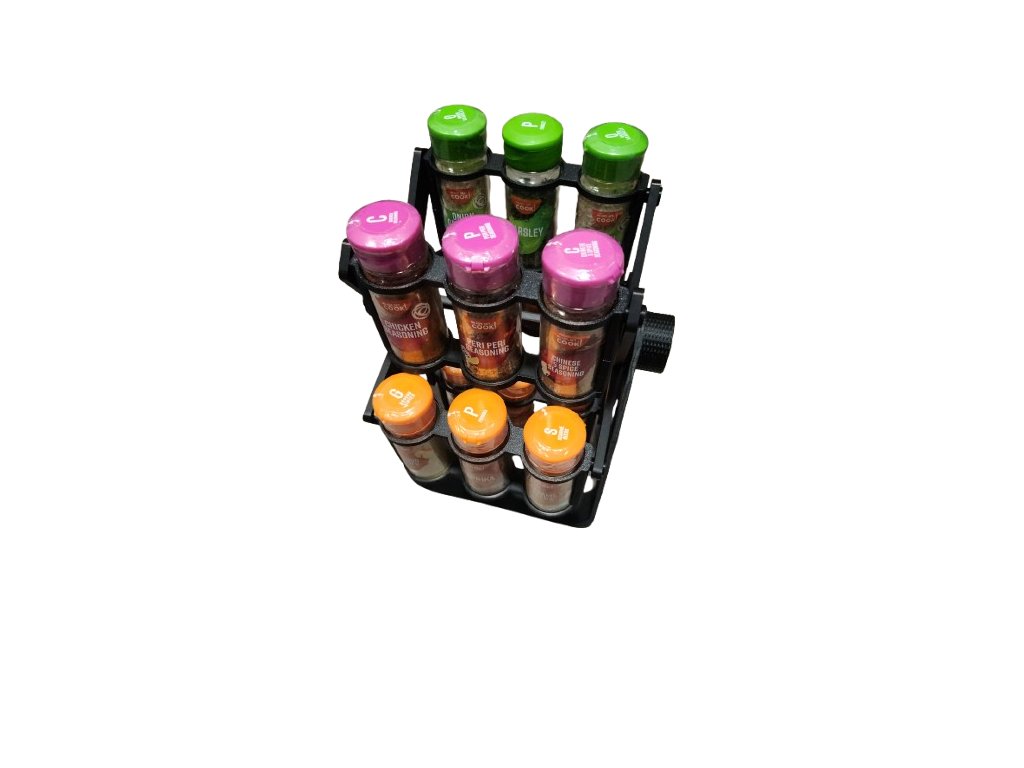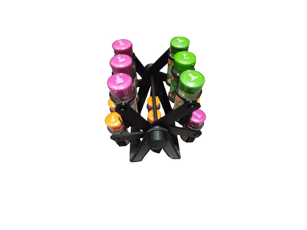 Különleges forgatható fűszertartó állvány, amely nemcsak praktikus, hanem látványos eleme is lehet a konyhának. Az állvány középső tengelye mentén fordul el, így a fűszerek egy mozdulattal átforgathatók és könnyen elérhetők.
