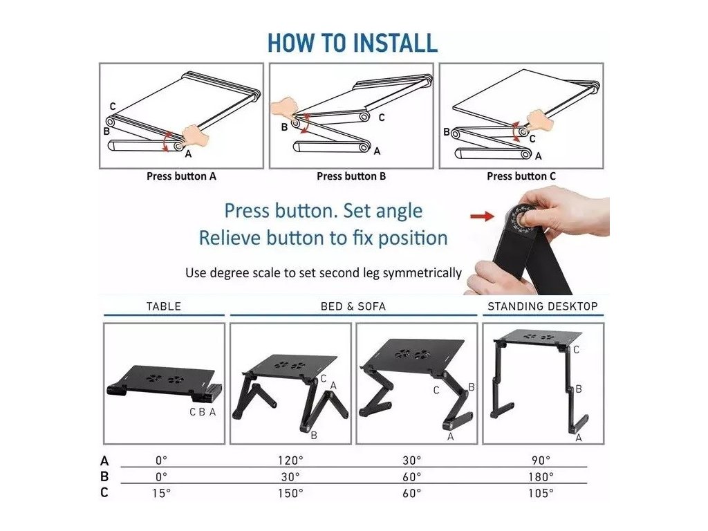 Ez a több ponton állítható laptop tartó akár otthoni, akár irodai használatra is ideális, a lábak beállításától függően használhatjuk akár asztalon, ágyban vagy önálló asztalként is.