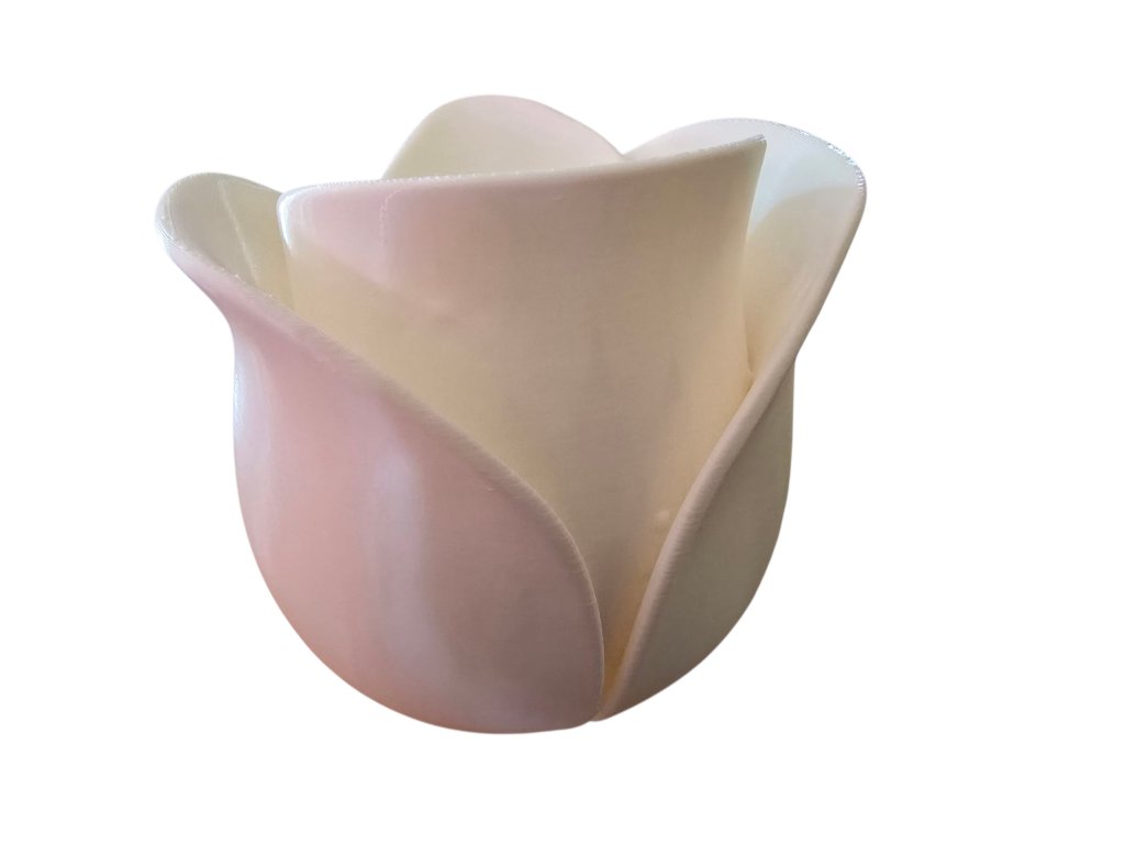 Ez a különleges, tulipán formájú váza PETG műanyagból készült 3D nyomtatással, amely ötvözi a modern technológiát a természet ihlette dizájnnal. A sima, fényes felület elegáns megjelenést biztosít, így kiváló választás otthoni dekorációként, ajándékként vagy esküvői kellékként is.
